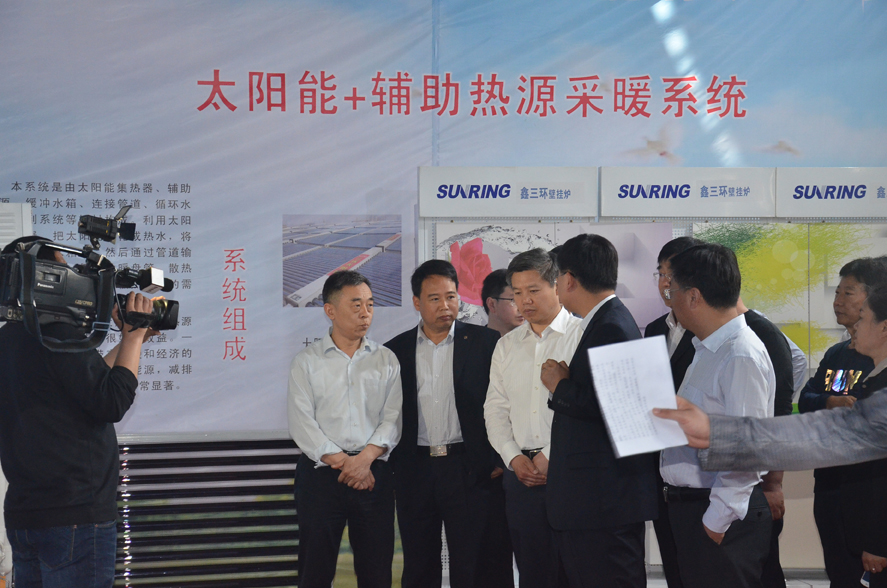 邢臺市市長董曉宇蒞臨我公司展位,我公司總經理張振杰介紹我公司新開發的太陽能+輔助熱源供暖系統。